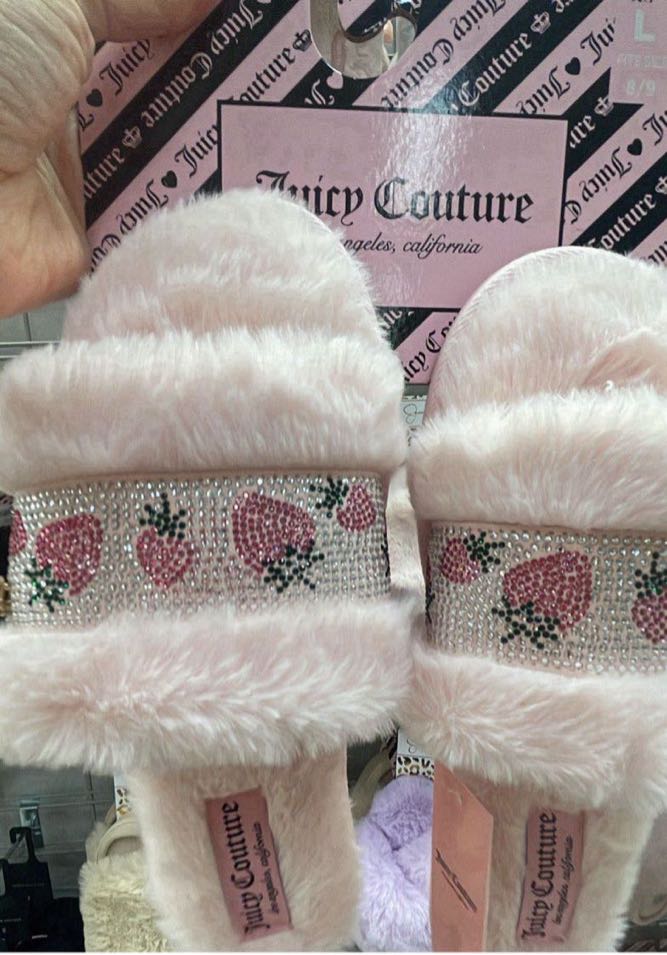 These plush slippers feature a soft pink design with decorative embellishments. Perfect for lounging at home.
