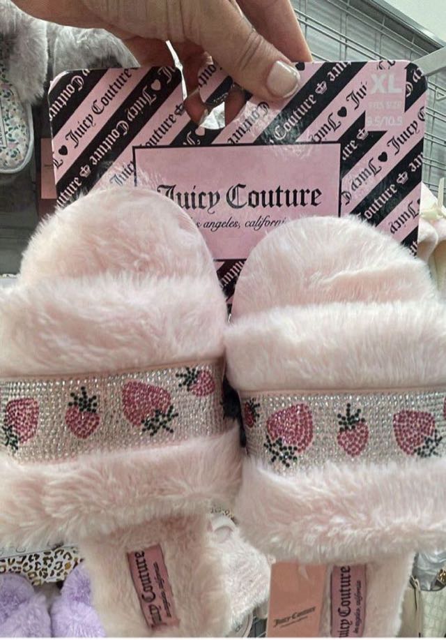 Cozy pink slippers with a fuzzy texture and strawberry embellishments.