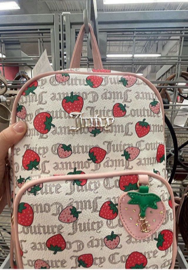 This stylish backpack features a playful strawberry print and a cute strawberry charm, perfect for adding a fun touch to your outfit.