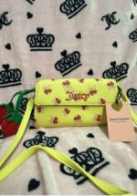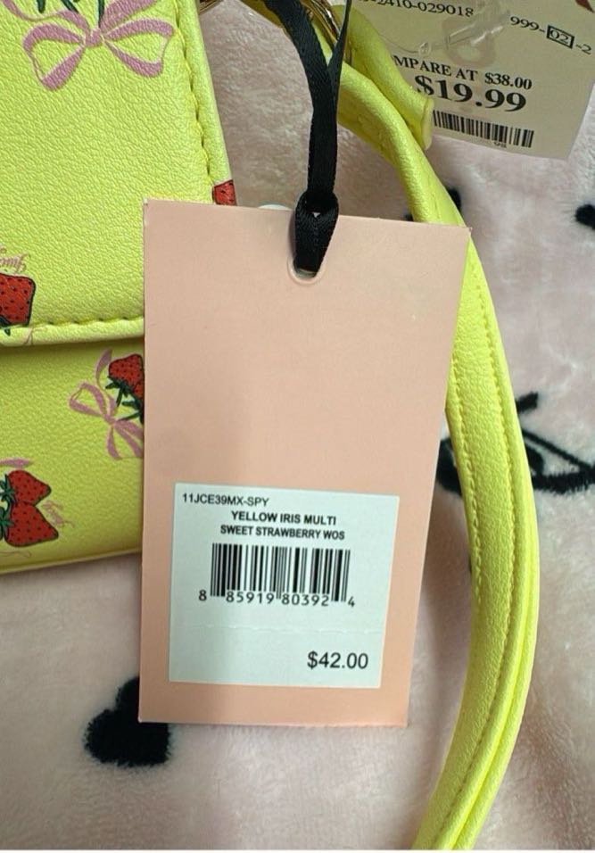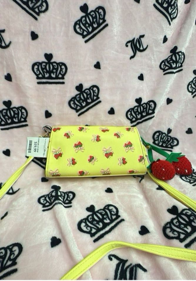 This vibrant yellow crossbody bag features a playful strawberry print and a detachable strawberry charm. Juicy Couture Yellow Iris Multi Strawberry WOS