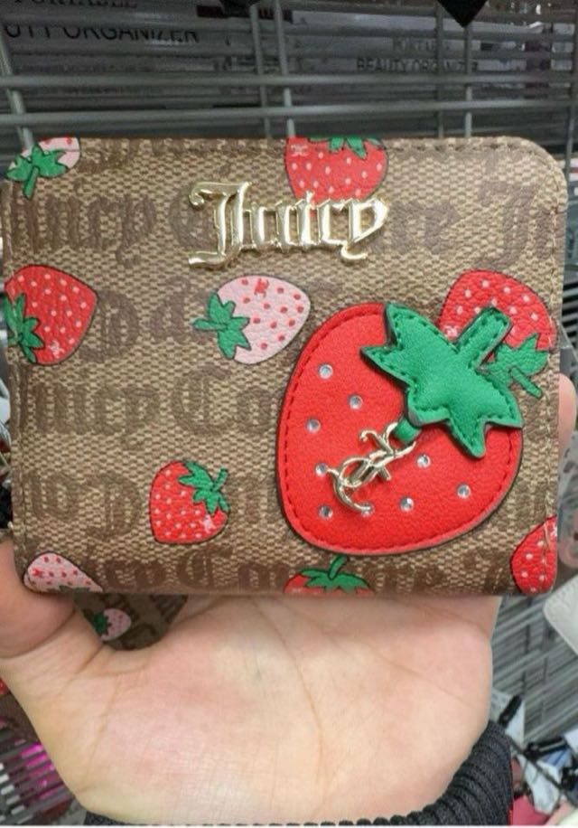 A stylish wallet featuring a strawberry design with a Juicy Couture logo.