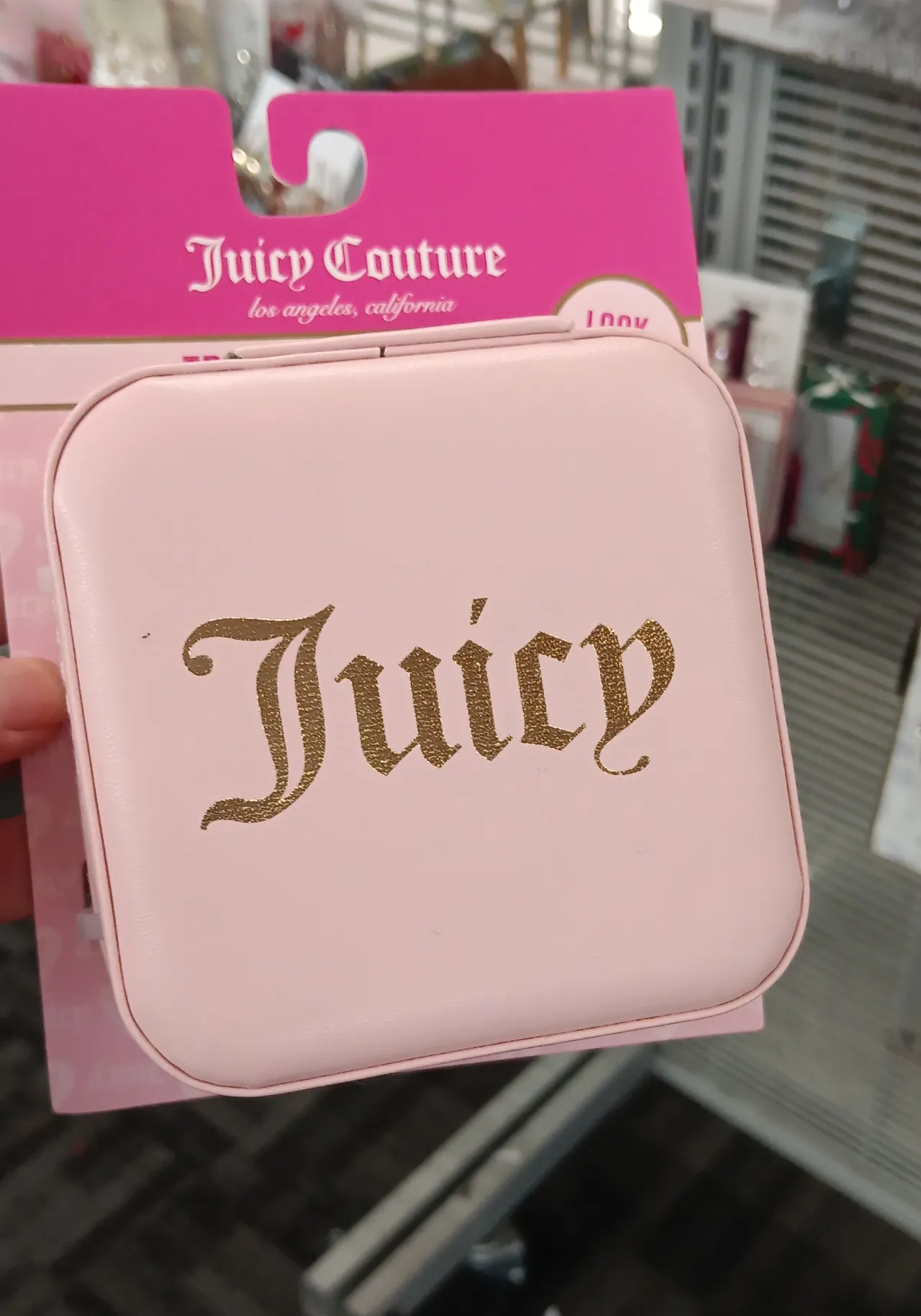 A stylish pink compact featuring the Juicy Couture logo in gold. Perfect for on-the-go touch-ups.