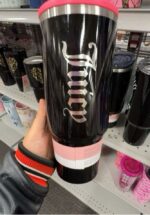 A stylish black travel mug featuring the Juicy Couture logo in silver. Ideal for on-the-go beverages.