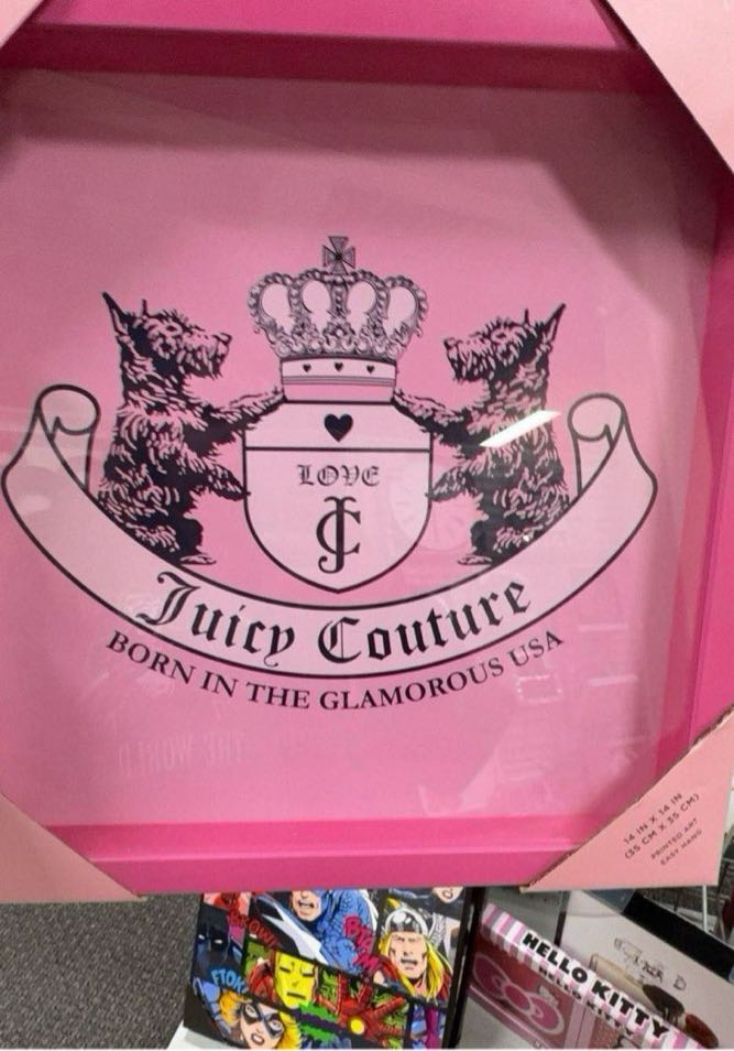 Framed wall art featuring the Juicy Couture logo with a pink background.