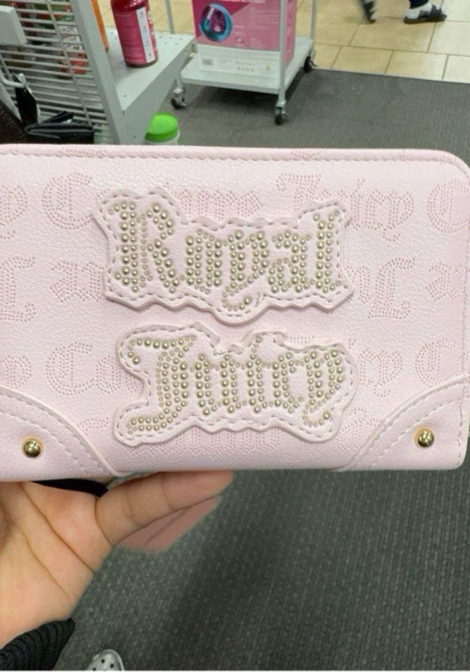 A stylish pink wallet featuring the ‘Royal Juicy’ logo embellished with rhinestones.