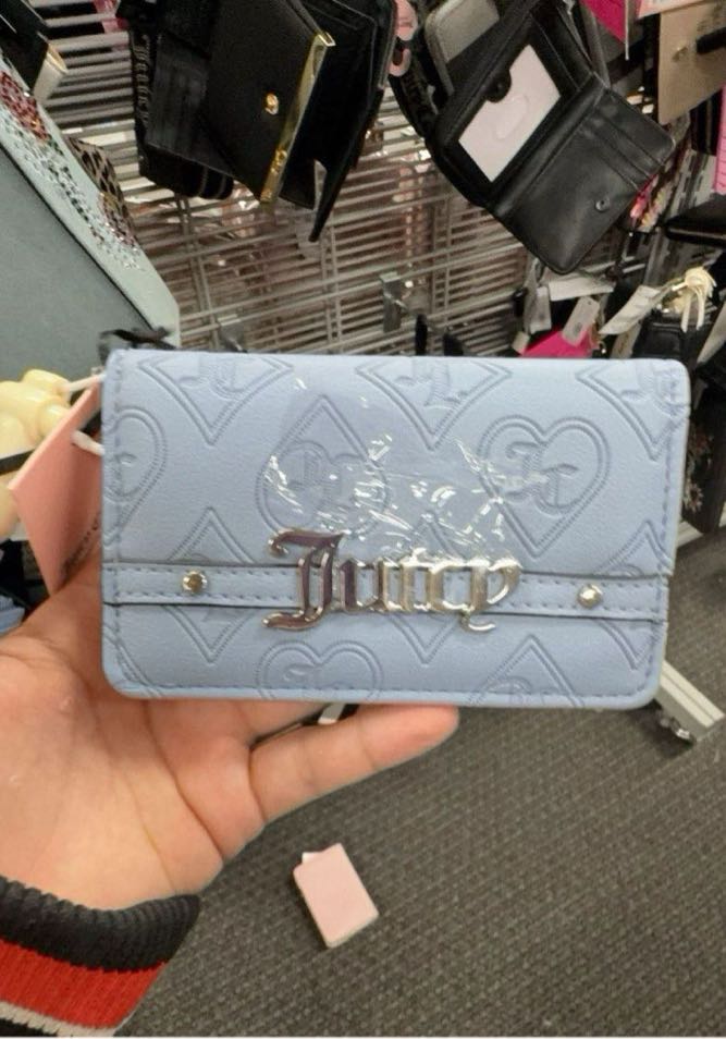 A stylish light blue wallet featuring a heart pattern and a metallic ‘Juicy’ logo.