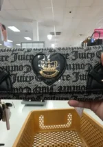 A stylish black and gray wallet featuring a heart-shaped emblem with a crown, adorned with the Juicy Couture logo.