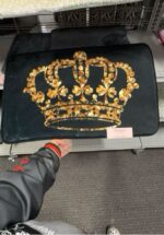 A decorative mat featuring a large golden crown design on a black background.