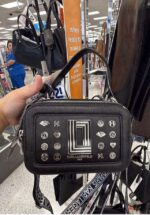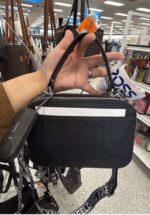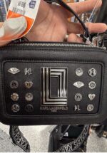 A stylish black handbag featuring a textured surface and decorative embellishments. It includes a detachable strap for versatile carrying options.
