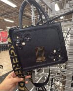 A stylish black handbag featuring floral embellishments and a gold logo plate.