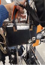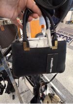 A stylish black handbag featuring gold accents and a compact design, perfect for everyday use.