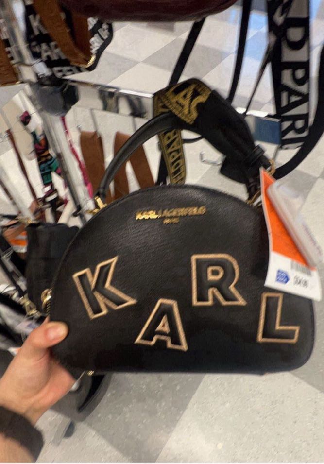 A stylish black handbag featuring bold ‘KARL’ lettering on the front.