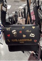 A stylish black crossbody bag featuring playful embellishments and a signature design from Karl Lagerfeld Paris. Perfect for adding a chic touch to any outfit.