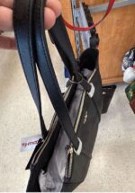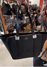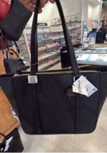 A stylish black tote bag featuring a structured design with dual handles and a zippered closure. Ideal for everyday use or as a chic accessory.