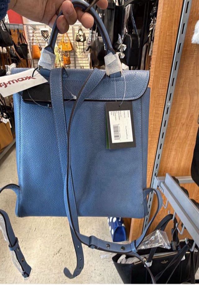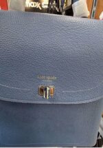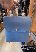 A stylish blue handbag with a structured design and a smooth leather finish. It features a top handle and a magnetic closure.