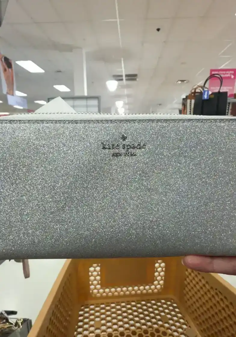 A stylish glitter wallet featuring a sleek design and the Kate Spade logo.