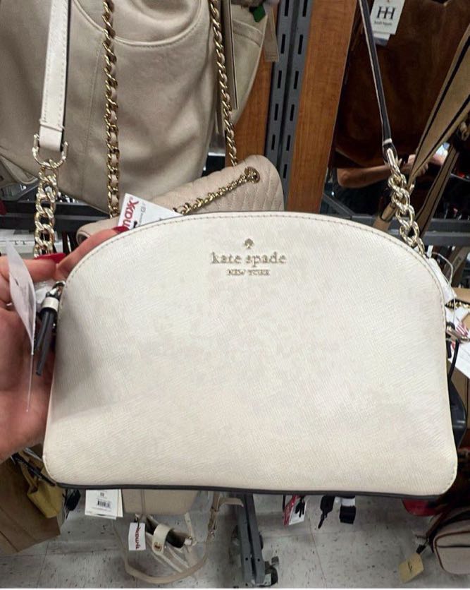 A stylish white handbag from Kate Spade, featuring a sleek design and chain strap.