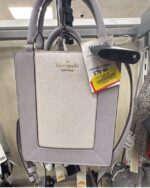 A stylish handbag featuring a combination of light gray and white leather with a structured design.