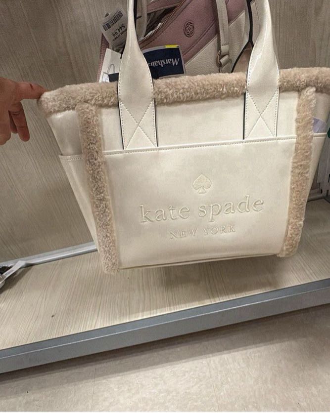 A stylish cream-colored tote bag with a soft, furry trim and embossed logo.