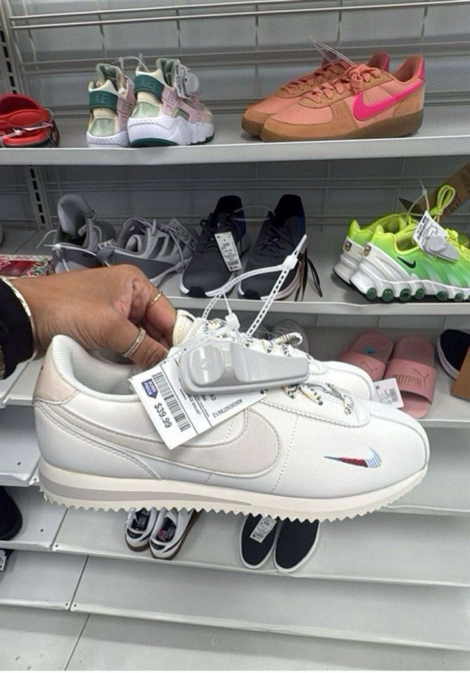 These Nike Classic Cortez sneakers feature a sleek design with a white upper and a colorful swoosh. Perfect for casual wear or athletic activities.