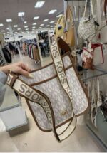 A stylish handbag featuring a signature logo design with a brown trim and adjustable strap.