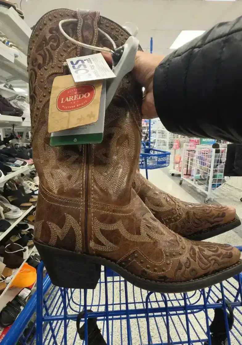 Stylish brown cowboy boots with intricate designs and a classic western look.