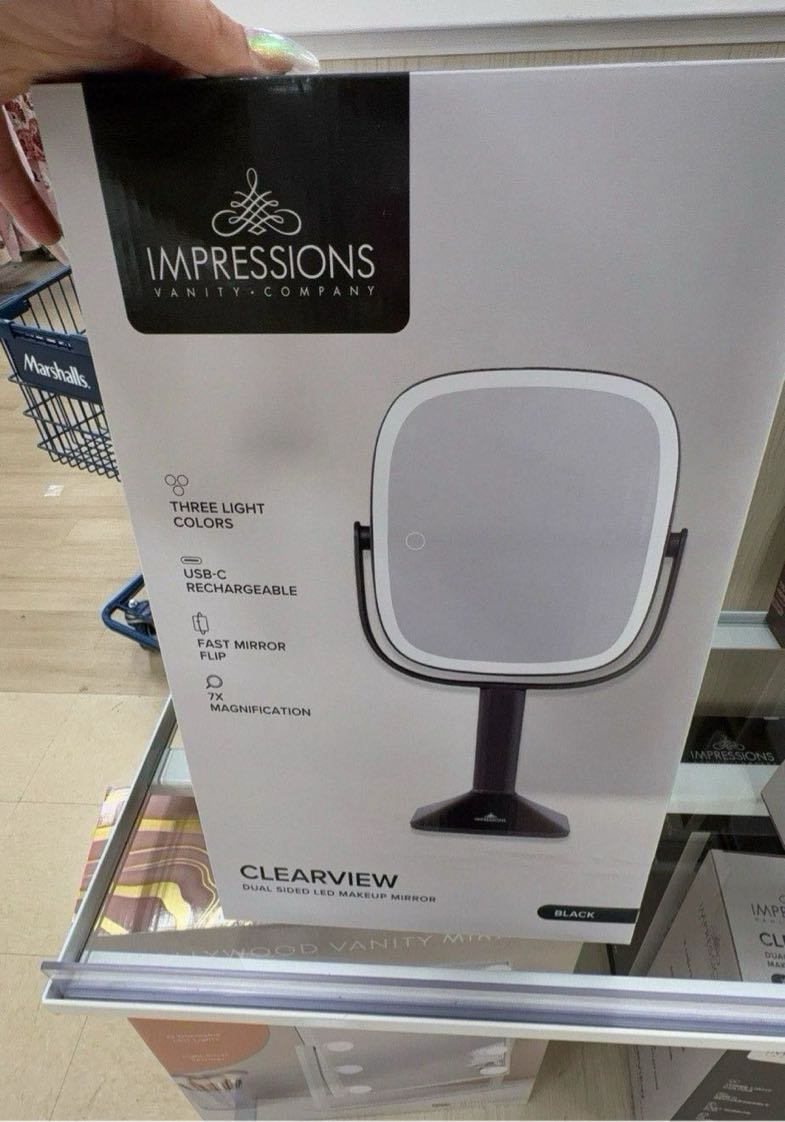 A rechargeable LED makeup mirror with three light colors and a magnification feature.