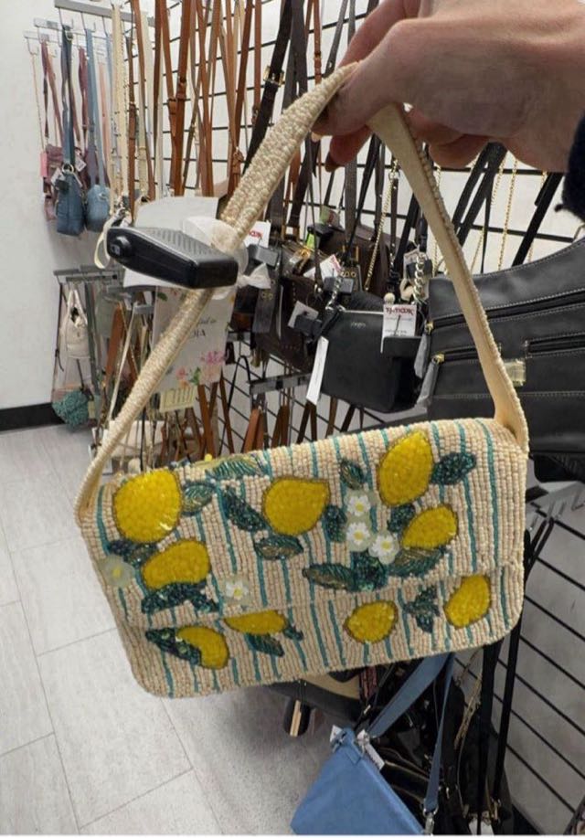 A stylish beaded handbag featuring a lemon design on a woven background.