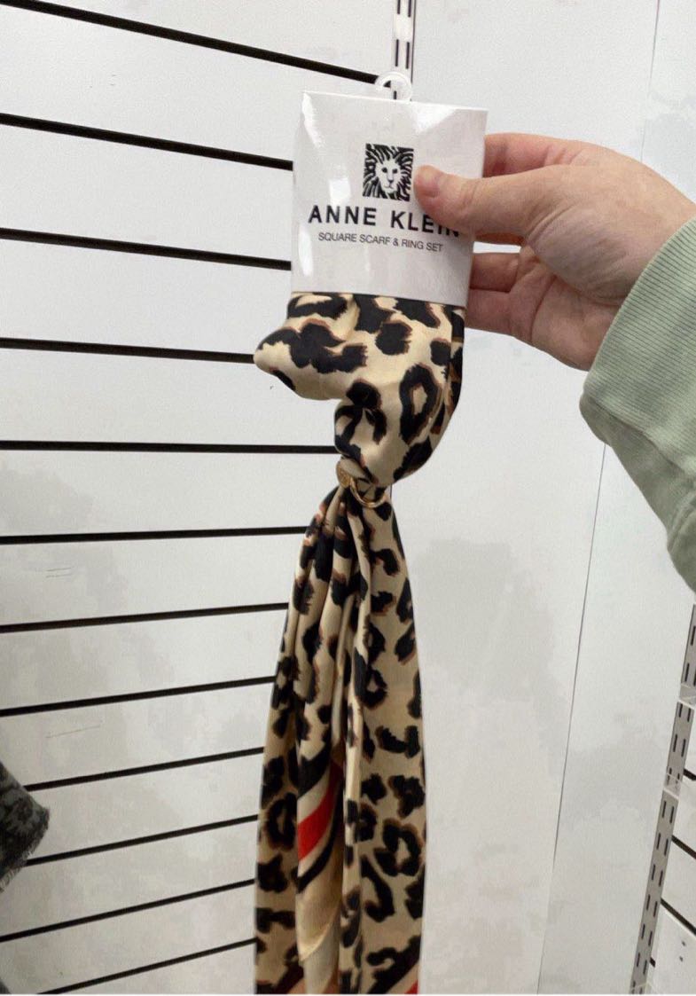 A stylish square scarf featuring a leopard print design, accompanied by a matching ring set.