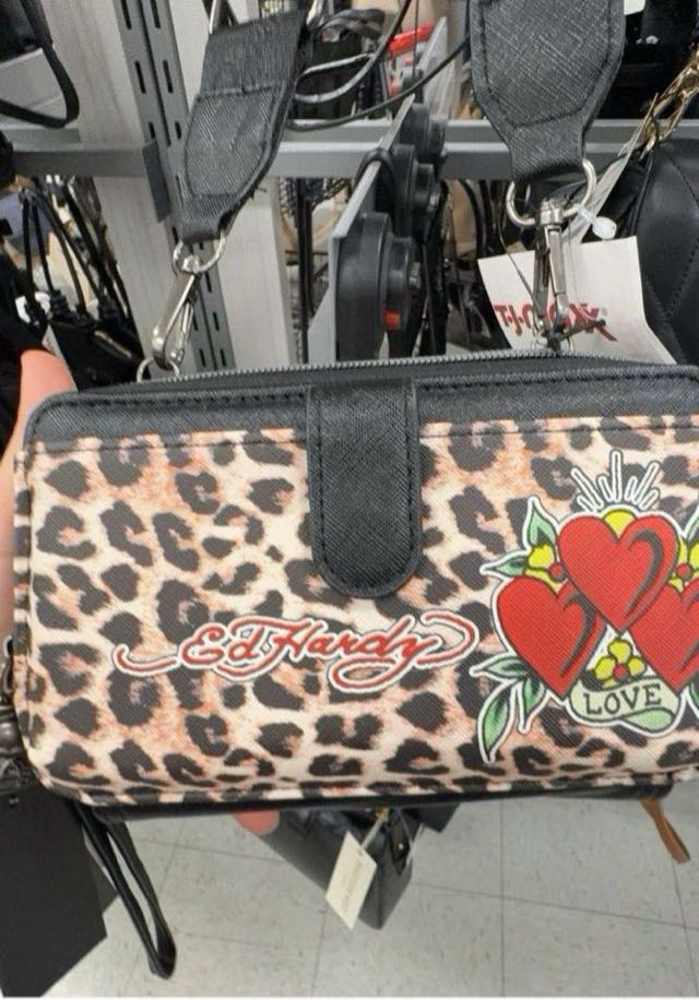 A stylish wallet featuring a leopard print design with heart graphics and the Ed Hardy logo.