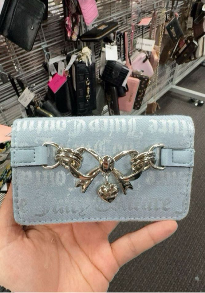 A stylish light blue wallet featuring a decorative silver bow and heart charm.
