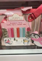 A festive collection of five lip balms in assorted flavors: Strawberry, Citrus, Vanilla, Cherry, Coconut, and Mint.