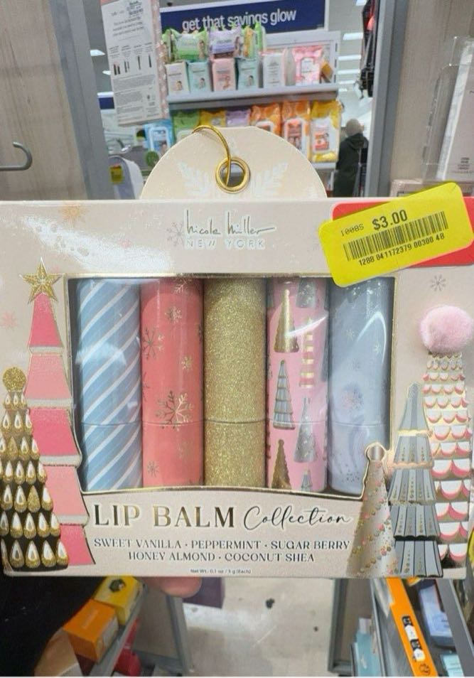 A festive set of lip balms in various flavors including Sweet Vanilla, Peppermint, Sugar Berry, Honey Almond, and Coconut Shea.