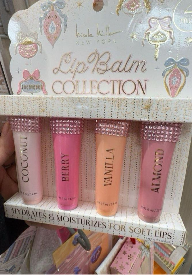 A collection of four lip balms in Coconut, Berry, Vanilla, and Almond flavors, designed to hydrate and moisturize for soft lips.