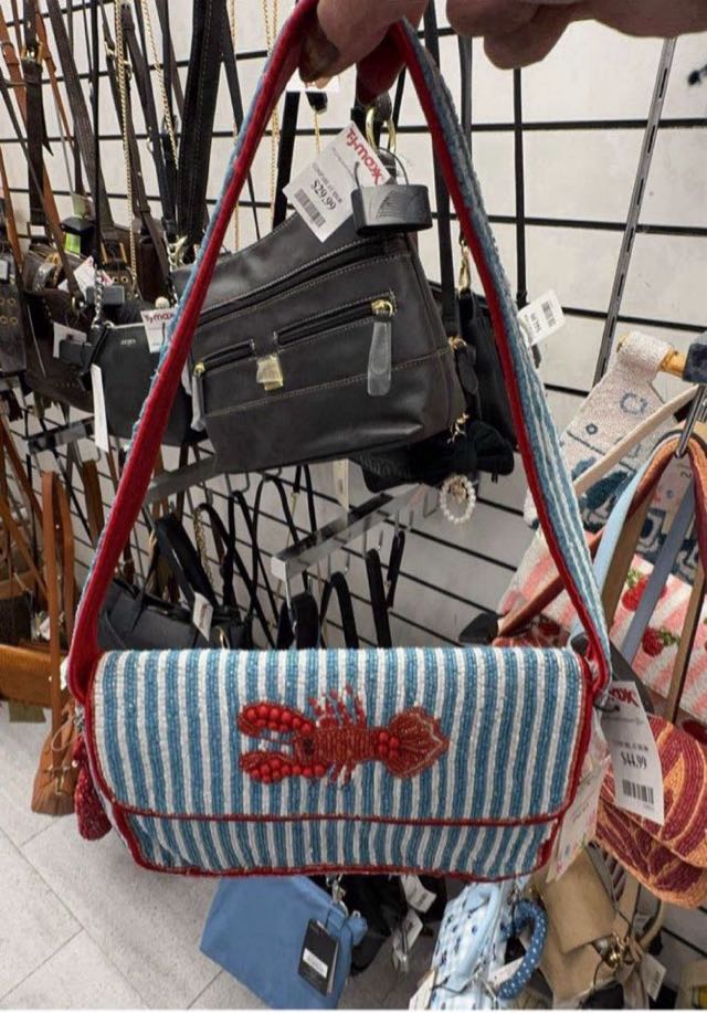 A stylish handbag featuring a lobster embroidery on a striped fabric design.