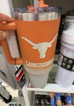 A stylish tumbler featuring a rhinestone Longhorns logo, perfect for keeping drinks hot or cold.