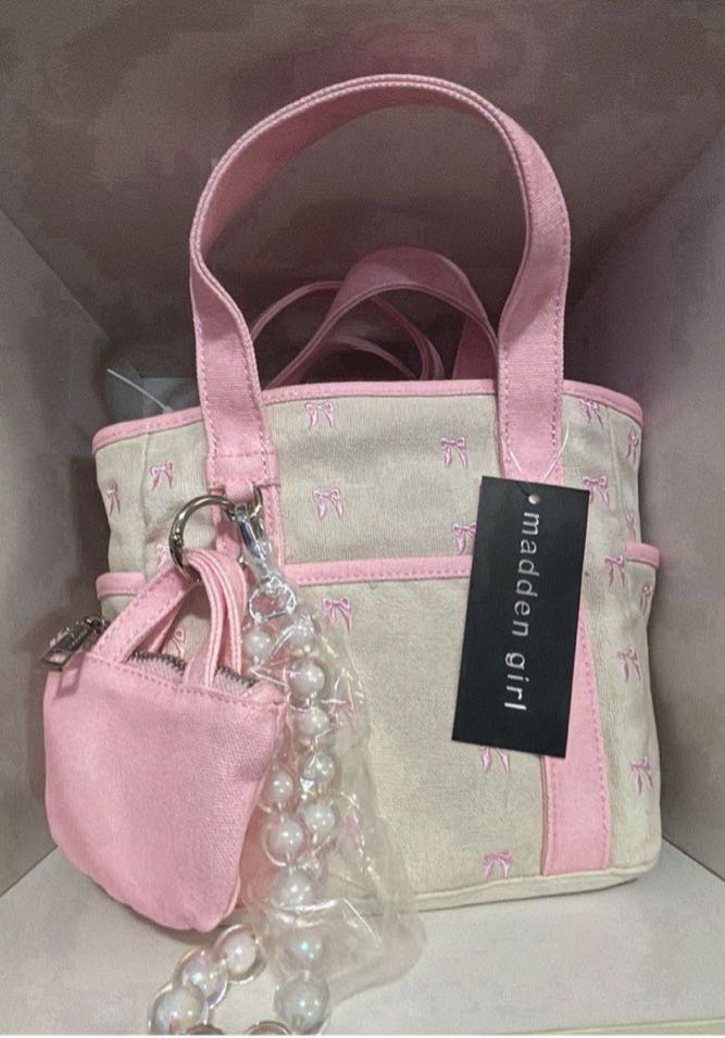 A stylish tote bag set featuring a larger tote with pink accents and a smaller matching bag, perfect for everyday use.