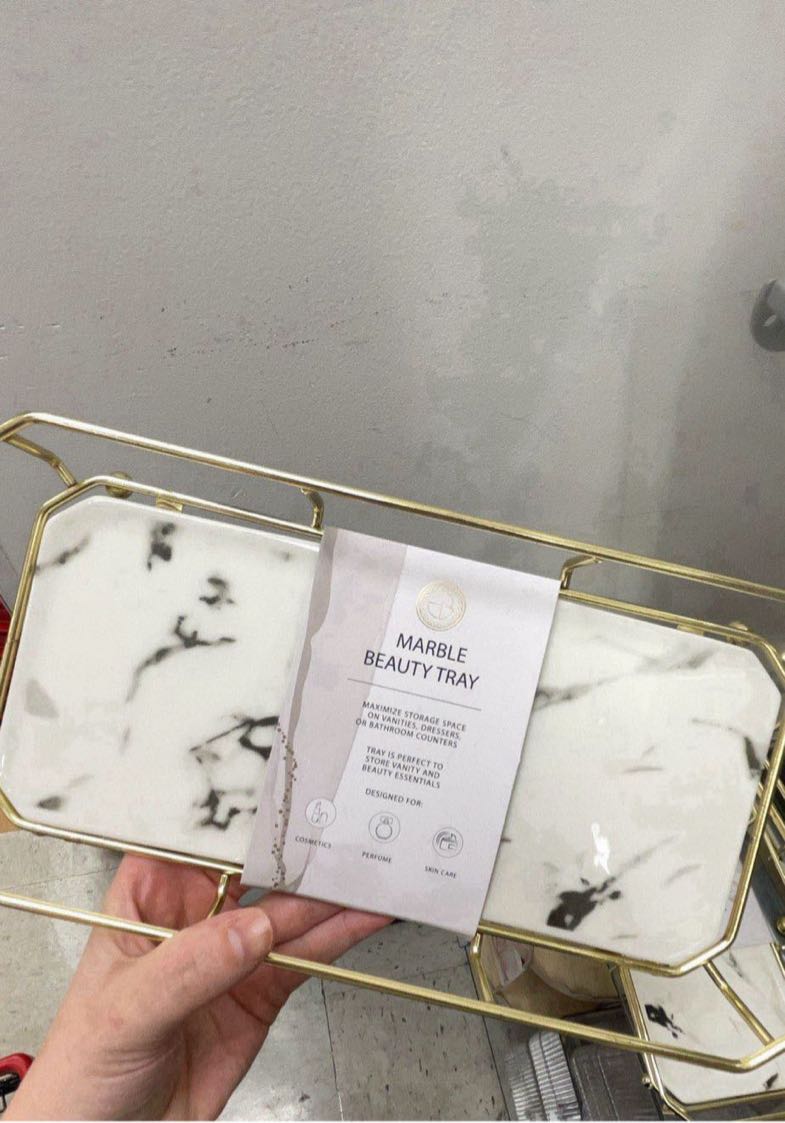 A stylish marble beauty tray with a gold metal frame, perfect for organizing cosmetics and accessories.