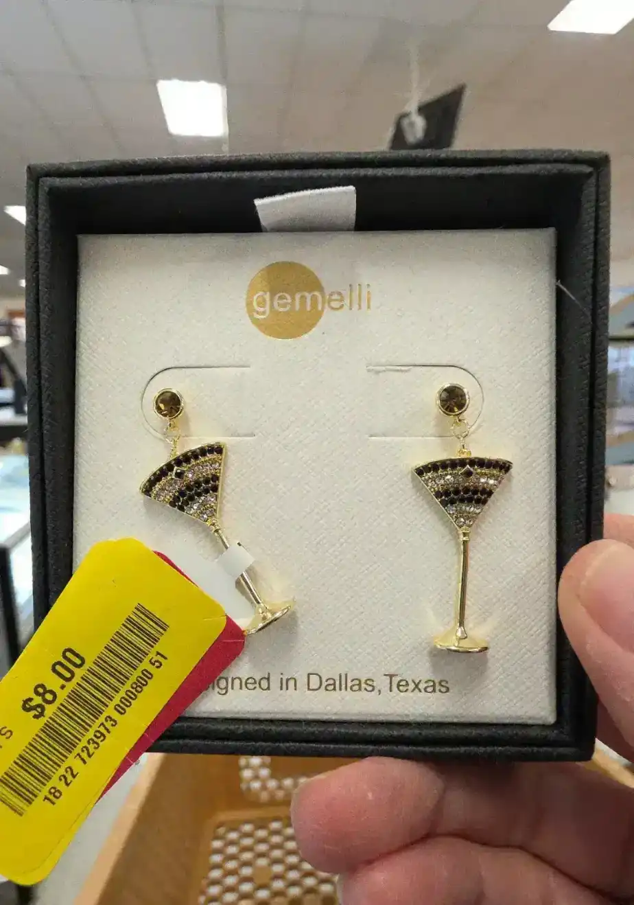 Gold-tone earrings shaped like martini glasses, embellished with black stones.