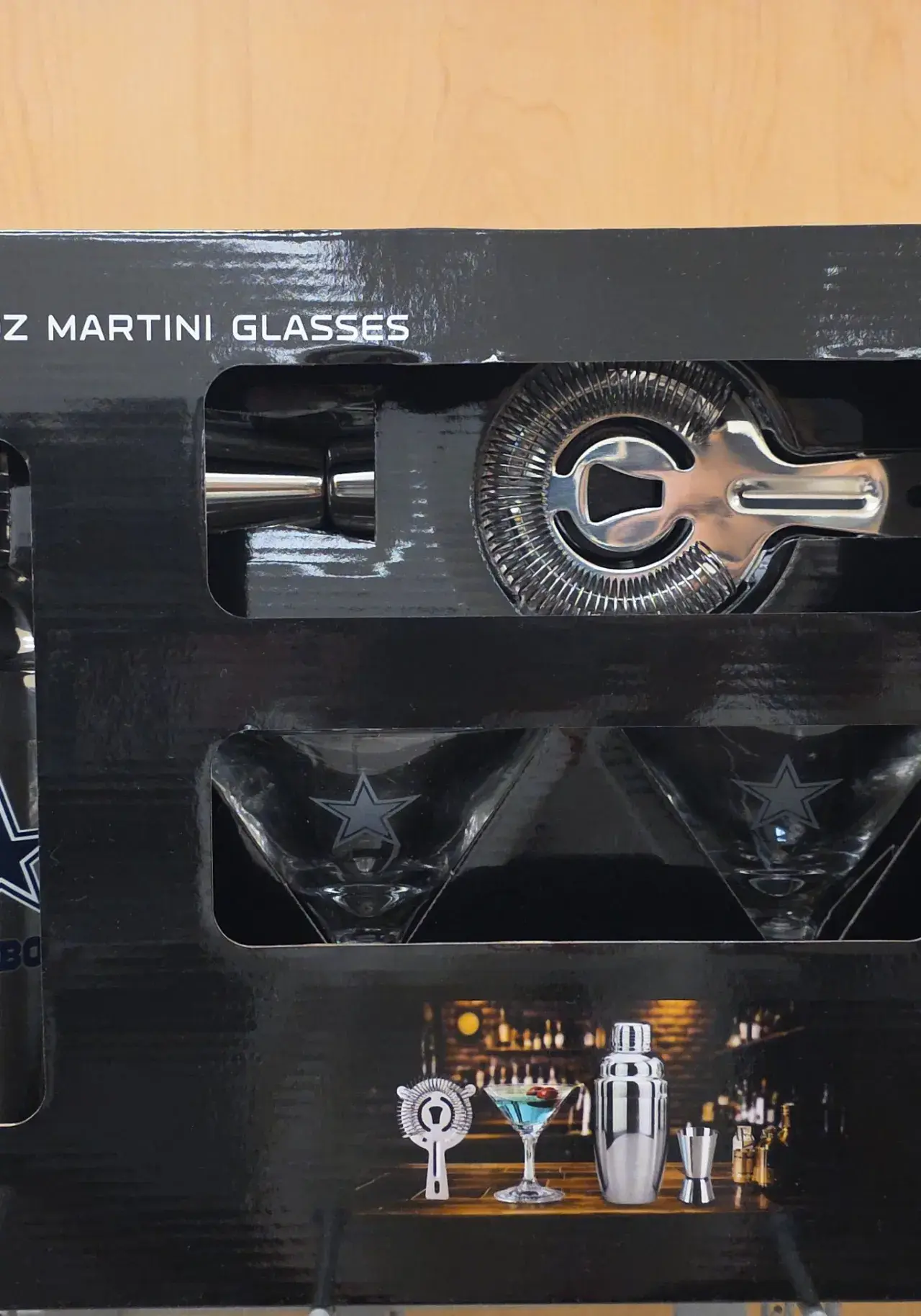 A stylish set of martini glasses with a cocktail shaker and strainer, perfect for entertaining.