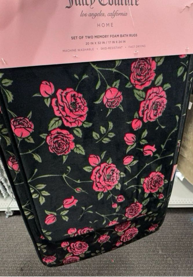 Set of two memory foam bath rugs featuring a floral design in pink and black.