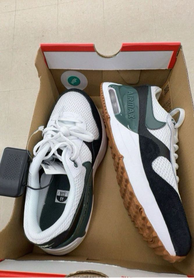 A pair of men’s athletic sneakers featuring a mix of white, green, and black colors with a modern design.