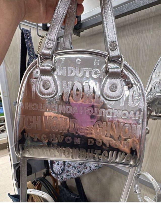 A stylish metallic handbag featuring a reflective surface with embossed branding.