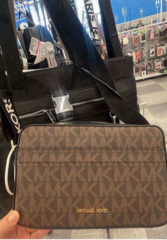 A stylish Michael Kors clutch featuring a signature logo pattern. Perfect for carrying essentials on the go.