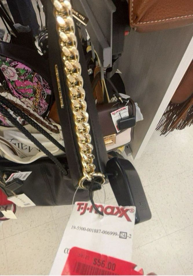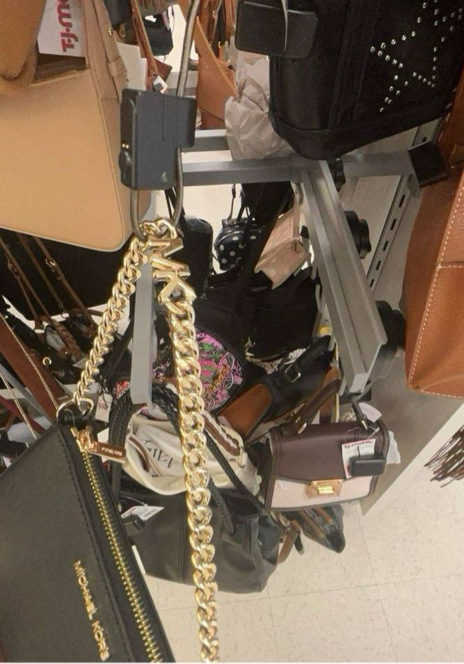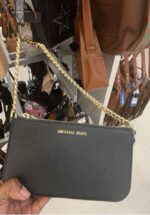 A stylish black crossbody bag with a gold chain strap, featuring the Michael Kors logo.