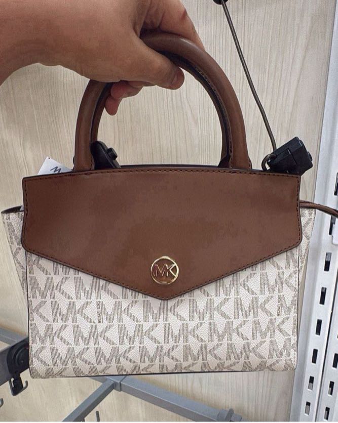 A stylish handbag featuring a combination of brown leather and a patterned fabric with the MK logo.