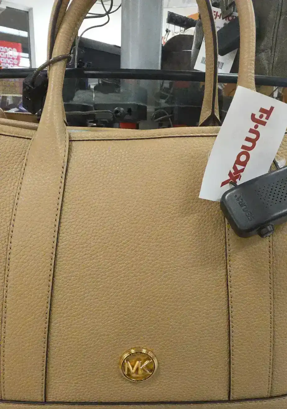 A stylish tan handbag featuring a gold MK logo.