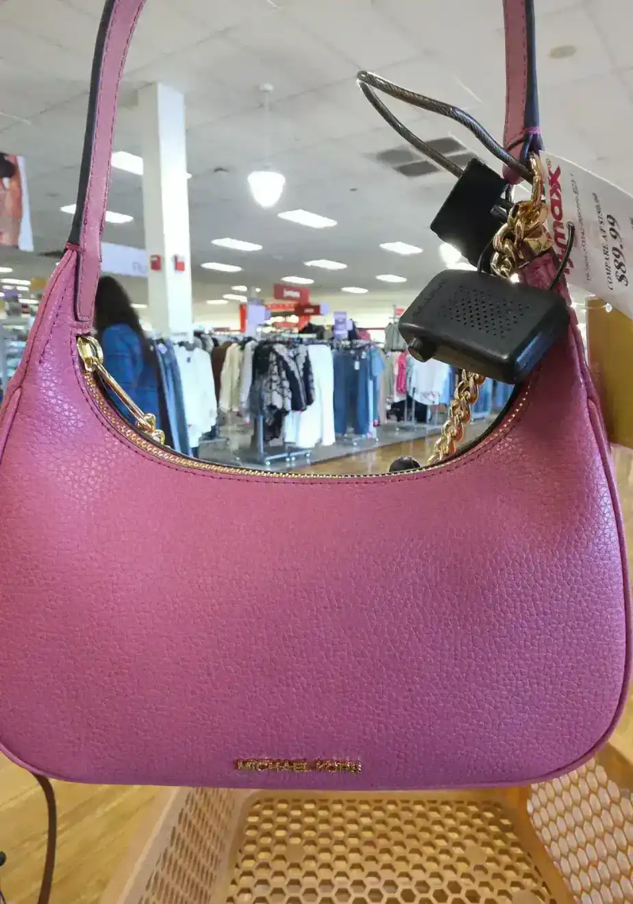 A stylish pink handbag by Michael Kors, featuring a chain strap and a textured finish.