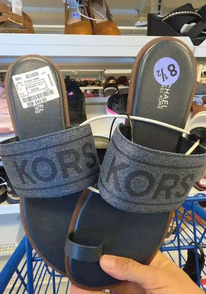 Stylish gray sandals featuring a wide strap with the ‘KORS’ logo.