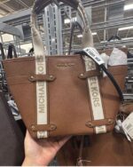 A stylish brown tote bag featuring the Michael Kors logo and a unique strap design.